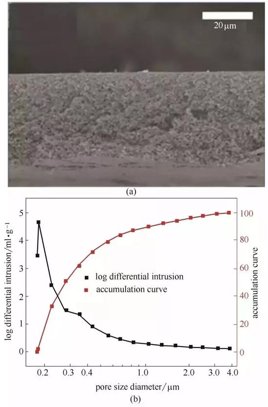 PMIA隔膜截面SEM圖和孔徑分布圖