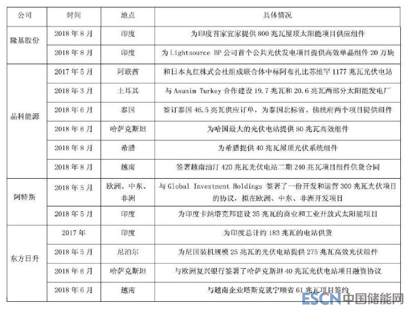 公共媒體以《路線圖》提到的64個(gè)主要沿線國(guó)家為“一帶一路”的路線藍(lán)本,對(duì)隆基股份、晶科能源、阿特斯、晶澳、東方日升、協(xié)鑫集成、天合能源、陽(yáng)光能源八家光伏企業(yè)在“一帶一路”發(fā)展?fàn)顩r進(jìn)行統(tǒng)計(jì)分析,以探索各家光伏企業(yè)布局“一帶一路”的趨勢(shì)。結(jié)果顯示,目前,中國(guó)光伏企業(yè)在“一帶一路”沿線主要活躍的區(qū)域?yàn)椋涸侥稀⒂《饶嵛鱽?、巴基斯坦、馬來(lái)西亞、印度、馬爾代夫、阿聯(lián)酋、沙特阿拉伯、土耳其、哈薩克斯坦、烏克蘭、俄羅斯、埃及、以色列等14國(guó)。其中,在印度、馬來(lái)西亞、越南、巴基斯坦、哈薩克斯坦、阿聯(lián)酋市場(chǎng)進(jìn)行投資、合資建設(shè)、收購(gòu)兼并、產(chǎn)品輸出最為頻繁。各企業(yè)中,隆基、晶科、協(xié)鑫集成、晶澳、天合光能5家企業(yè)重點(diǎn)布局在產(chǎn)業(yè)鏈上游和中游的生產(chǎn)環(huán)節(jié),阿特斯、東方日升主推電站建設(shè),陽(yáng)光能源以開(kāi)發(fā)光儲(chǔ)一體化項(xiàng)目為主。