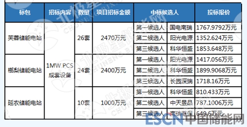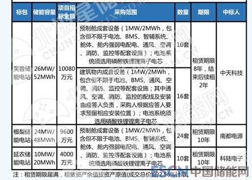 電池、智輔系統(tǒng)、預(yù)制艙成套設(shè)備租賃,中天、南都電源、科陸電子分別中標(biāo)。