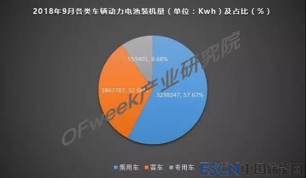 從車輛細分類別來看,2018年9月,我國新能源乘用車動力電池裝機量約為3.30GWh,占比57.67%,新能源客車動力電池裝機量約為1.87Gwh,占比32.66%,新能源專用車動力電池裝機量約為0.55Gwh,占比9.68%。其中新能源客車裝機量超過8月裝機量1Gwh。