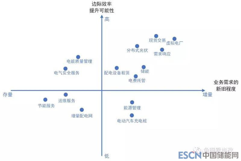 下面我們按照上述的兩個(gè)維度,對(duì)現(xiàn)有的一些綜合能源服務(wù)業(yè)務(wù)進(jìn)行了定位,這只是一個(gè)示意圖,并不代表未來(lái)的趨勢(shì)和方向,僅供大家參考。