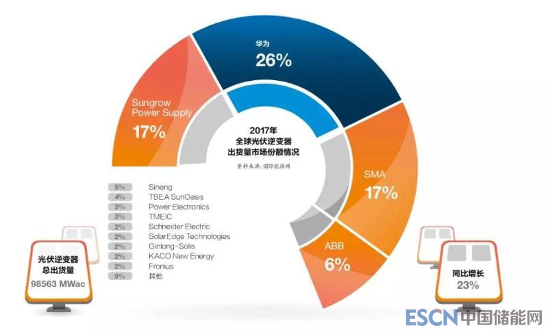 這個(gè)榜單發(fā)布的2017全球光伏逆變器出貨量也顯示,華為以26.4%的市場(chǎng)占有率連任全球第一大逆變器供應(yīng)商。