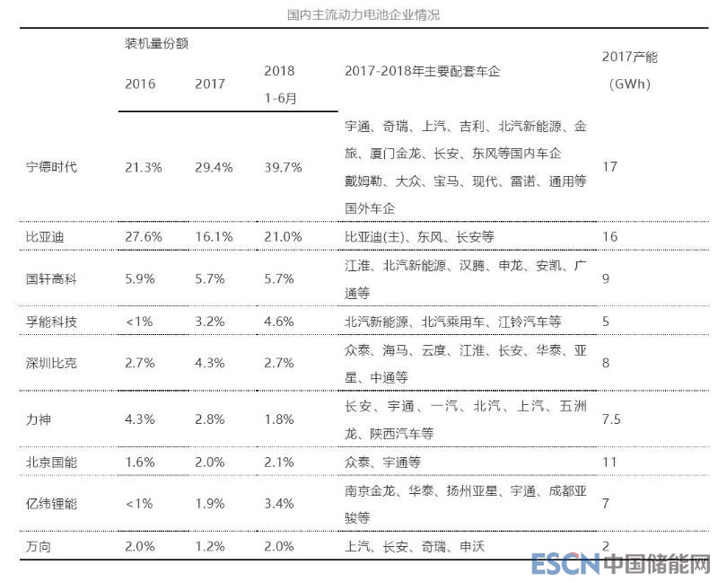 產(chǎn)能的高端與低端是相對(duì)的,一般根據(jù)動(dòng)力電池產(chǎn)品品質(zhì)、生產(chǎn)技術(shù)水平、企業(yè)綜合實(shí)力、市場(chǎng)份額、應(yīng)用領(lǐng)域來(lái)區(qū)分,通常也是主流車(chē)企的配套首選。高端產(chǎn)能的市場(chǎng)需求量正在提高,可從裝機(jī)量說(shuō)明。2017年我國(guó)前10家動(dòng)力電池企業(yè)裝機(jī)量總和達(dá)到26.7GWh,市場(chǎng)占有率為73.6%,2018年上半年增長(zhǎng)到約85%。國(guó)內(nèi)主流動(dòng)力電池企業(yè)以寧德時(shí)代、比亞迪為龍頭,是高端產(chǎn)能的集中陣營(yíng),貢獻(xiàn)了行業(yè)內(nèi)70%以上的裝機(jī)需求量。其中龍頭企業(yè)寧德時(shí)代、比亞迪的市場(chǎng)占有率由2017年的45.5%,提升到2018年上半年的60.7%。