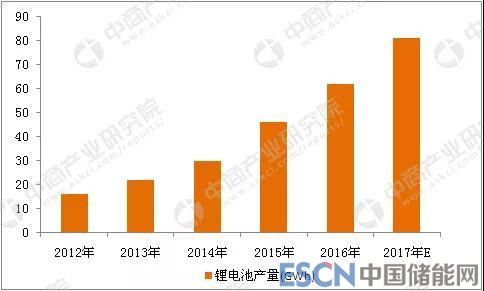 鋰離子電池兩大應(yīng)用領(lǐng)域——手機(jī)和電動(dòng)汽車(chē)的產(chǎn)量呈現(xiàn)不同程度的快速增長(zhǎng)。主要下游產(chǎn)品產(chǎn)量快速增長(zhǎng),帶動(dòng)鋰離子電池需求猛增,預(yù)計(jì)2017 年中國(guó)鋰電池產(chǎn)量將達(dá)到81GWh。