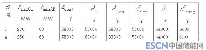 模式1下,場景3和場景4的購電成本有較大的差別,而模式2下,場景3和場景4的購電成本相等。場景3和場景4的差別主要是G1的容量不同。模式2下,反映出了節(jié)點A發(fā)電容量的不足,給出了比較高的缺稀收益。
