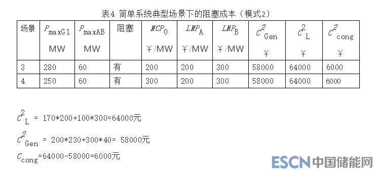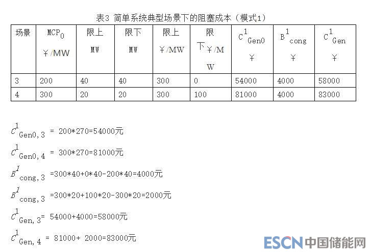 模式1-1:這種方法對應英國第一階段改革Pool模式。由于阻塞出力增加的部分稱為限上,由于阻塞出力減小的部分稱為限下。對限上部分按照報價支付。本例中,限上就是機組2由于阻塞增發(fā)的部分,在情況3、4中分別為40MW、20MW,按其報價300支付。對限下部分按照(MCP-報價)支付(如果報價反映電廠的成本,這個差價就反映其由于阻塞損失的收益)。本例中,限下就是機組1由于阻塞減發(fā)的部分,在情況3、4中分別為40MW、20MW,分別按照(200-200)、(300-200)支付。表3中Σbuy指無阻塞下的總購電成本,B1cong指模式1下阻塞造成的購電成本的增加。B1cong包括三個部分:支付給限上機組的補償、支付給限下機組的補償、減少的限下機組的支出。