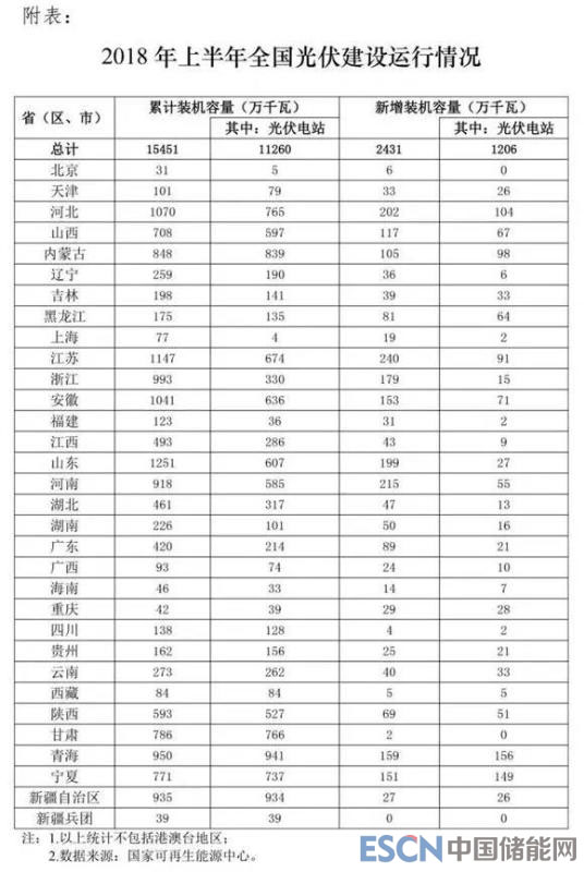 截至2018年6月底,全國光伏發(fā)電裝機容量達到15451萬千瓦,其中,光伏電站11260萬千瓦,分布式光伏4190.3萬千瓦。上半年光伏發(fā)電量823.9億千瓦時,同比增長59%;棄光率3.6%,同比下降3.2個百分點。棄光主要集中在新疆和甘肅,其中,新疆(不含兵團)棄光電量13.5億千瓦時,棄光率20%,同比下降6.1個百分點;甘肅棄光電量5.9億千瓦時,棄光率11%,同比下降11個百分點。
