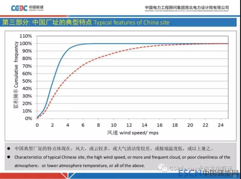 最后再強調(diào)一下風(fēng)的問題,風(fēng)大的話集熱器設(shè)計成本比較高,比如上面這一組曲線,橫坐標(biāo)是風(fēng)速,縱坐標(biāo)是風(fēng)速累積頻率結(jié)果,兩個曲線代表兩個廠址。比如這個電站集熱器要確保99%的風(fēng)速下都可以工作,如果是紅色間斷線代表的廠址,那么這個地區(qū)風(fēng)比較大,會發(fā)現(xiàn)集熱器抗風(fēng)要求比較高,可能到15m/s或者更高,這里的風(fēng)速是10米高的平均風(fēng)速,跟外國常說的3s陣風(fēng)的不太一樣,這里有個既定的轉(zhuǎn)化關(guān)系。而對于藍色實線代表的廠址,累積概率99%時對應(yīng)的風(fēng)大部分情況下都是6m/s以內(nèi),集熱器前期投資可以控制在比較低的水平。