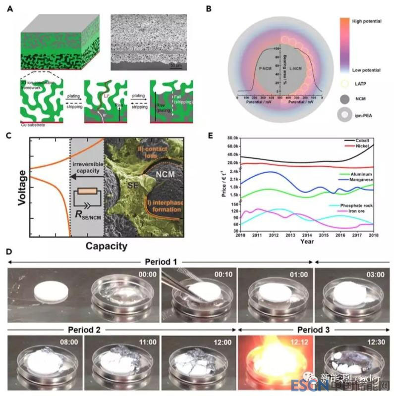 通常我們認為固態(tài)電解質的安全性是其一大優(yōu)勢,特別是氧化物固態(tài)電解質不具有可燃性,因此安全性要遠遠好于傳統(tǒng)的碳酸酯類電解液,但是Chung和Kang等人研究卻發(fā)現(xiàn)即便是全固態(tài)電池也存在熱失控的風險。首先他們將Li1.5Al0.5Ge1.5(PO4)3固態(tài)電解質(熔點超過1100℃)壓成片,然后放入到熔化的金屬鋰(熔點180℃)之中(如下圖D所示),固態(tài)電解質片首先會漂浮在金屬鋰的表面,然后固態(tài)電解質片開始發(fā)生破碎和粉化,最后發(fā)生了熱失控。因此全固態(tài)電池固然安全性要好于碳酸酯類電解液,但是全固態(tài)電池仍然存在熱失控的風險,在全固態(tài)電池的設計和應用中也需要充分考慮熱失控的風險。
