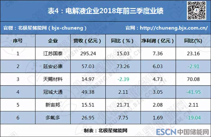 前三季度,電解液企業(yè)業(yè)績普遍飄紅,但除江蘇國泰、天賜材料和新宙邦外,其他企業(yè)凈利潤出現(xiàn)下滑(詳見表4)。此外,天賜材料凈利潤增長主要由于參股子公司容匯鋰業(yè)會計核算方法變更以及處置其股權(quán)導(dǎo)致投資收益增加所致,一旦扣除這一因素影響后,天賜材料凈利潤將同比下降92.25%。因此,受價格下滑影響,電解液企業(yè)盈利能力也普遍下降。