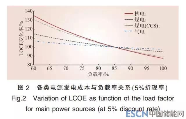 電源的LCOE受其負(fù)載率影響很大,這種影響程度隨著總成本中燃料成本和排放成本的比例變化而變化。最近的IEA/NEA研究報(bào)告分析了各主要電源的總發(fā)電成本構(gòu)成,如表3所示。對(duì)核電而言,由于其成本構(gòu)成主要是投資成本,燃料成本通常不超過總成本的20%,無碳排放成本,因此當(dāng)核電參與系統(tǒng)調(diào)峰時(shí),由負(fù)載率下降(年發(fā)電量等比例減少)引起的LCOE變化相較其他電源更大。根據(jù)2010年國(guó)際原子能機(jī)構(gòu)數(shù)據(jù),在折現(xiàn)率5%的情況下,負(fù)載率由90%降至70%時(shí),核電LCOE上升約35%,遠(yuǎn)高于煤電的10%和氣電的7%(如圖2所示)。