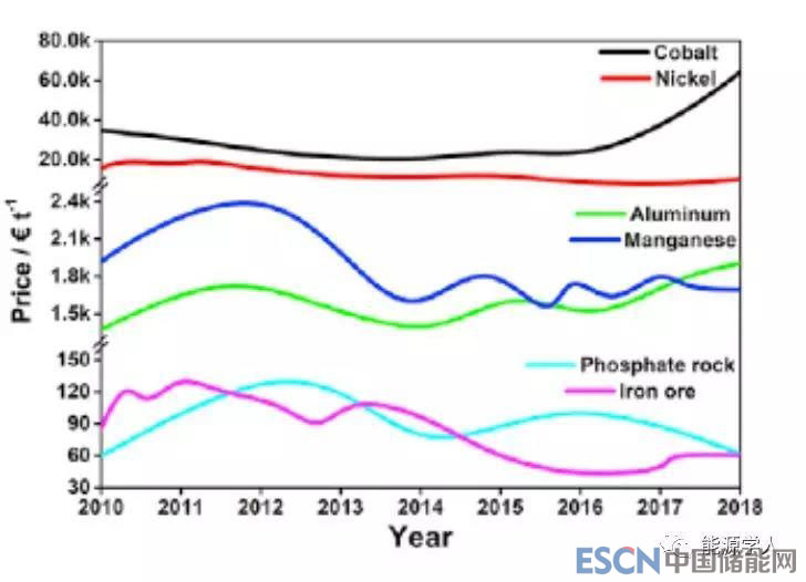 生產(chǎn)成本無(wú)疑是產(chǎn)業(yè)化必須要考慮的問(wèn)題之一,本文作者總結(jié)了近年來(lái)組成Li嵌入式正極材料的金屬元素的市場(chǎng)價(jià)格,如圖5。其中元素Co和元素Ni的價(jià)格普遍高于元素Al和元素Mg,而元素P和Fe具有相對(duì)更低的價(jià)格。值得注意的是元素Co從2016年起,價(jià)格飛升,這無(wú)疑會(huì)提升基于元素Co等LCO等正極材料的成本,對(duì)其更大的規(guī)?;l(fā)展有一定影響。