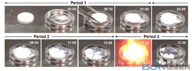 安全性是固態(tài)電解質(zhì)的巨大優(yōu)勢(shì),但是固態(tài)電解質(zhì)并不是絕對(duì)的安全,本文作者列舉了Chung and Kang等人的工作,如圖4所示,將Li1.5Al0.5Ge1.5(PO4)3 pellet放置在熱融化的金屬鋰上面,隨著時(shí)間的推移,固態(tài)電解質(zhì)依舊會(huì)燃燒,盡管其融點(diǎn)大于1100℃,這主要是由于電解質(zhì)與金屬負(fù)極在高溫狀態(tài)下不穩(wěn)定導(dǎo)致的。同樣,正極材料能否在高溫下保持穩(wěn)定也決定著鋰電池的最終安全性。作者綜述了Li嵌入式正極材料的安全性具有LFP > LMO > NMC >NCA > LCO的排列順序。LFP具有最好的安全性,Mn元素能夠提高正極材料的熱穩(wěn)定性,但Ni和Co元素對(duì)于材料的熱穩(wěn)定性則是不利的。