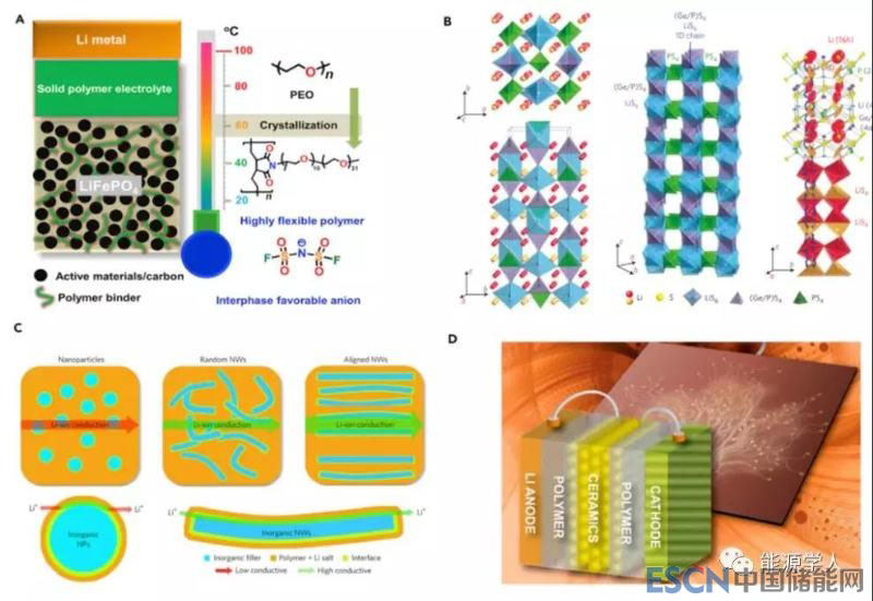固態(tài)電解質(zhì)包括聚合物固態(tài)電解質(zhì)、無(wú)機(jī)固態(tài)電解質(zhì)以及聚合物-無(wú)機(jī)復(fù)合固態(tài)電解質(zhì),固態(tài)電解質(zhì)從發(fā)現(xiàn)到現(xiàn)在已經(jīng)有40多年,然而僅有基于聚合物電解質(zhì)的Li/PEO/LFP電池在Bollore Bluecar中得到了應(yīng)用,但是其必須搭載加熱裝置使電池在70℃進(jìn)行工作,這主要是因?yàn)槭褂冒虢Y(jié)晶的PEO電解質(zhì)造成的。那么,能否開(kāi)發(fā)室溫固態(tài)電解質(zhì)呢?本文介紹了Armand等人設(shè)計(jì)出了一種室溫聚合物(Jeffamines)電解質(zhì),其匹配的Li/LFP電池能夠在室溫下具有很高的電導(dǎo)率并且表現(xiàn)出優(yōu)異的界面性能,如圖3A所示。另外,Kamaya等人報(bào)道了Li10GeP2S12(LGPS)無(wú)機(jī)固態(tài)電解質(zhì)(圖3B),室溫下離子電導(dǎo)率能夠達(dá)到1.23*10-2 S/cm,并且該固態(tài)電解質(zhì)能夠匹配LFP、LCO, NCA, LNMO等Li嵌入式正極。對(duì)于聚合物-無(wú)機(jī)復(fù)合固態(tài)電解質(zhì),早在1980s就有報(bào)道,在聚合物中加入納米Al2O3便能提高電解質(zhì)的機(jī)械性能和離子電導(dǎo)率,最近幾年,Cui等人將納米線(xiàn)狀的LLTO加入到PAN聚合物電解質(zhì)中從而顯著提升了其離子電導(dǎo)率,如圖3C所示。Goodenough等人提出了聚合物-無(wú)機(jī)陶瓷-聚合物的“三明治”結(jié)構(gòu)的復(fù)合固態(tài)電解質(zhì)(圖3D),中間的陶瓷層阻止了鋰鹽中的陰離子的穿梭,從而提高了鋰離子遷移數(shù),但同時(shí)也帶來(lái)了體積膨脹,能量密度降低等問(wèn)題。