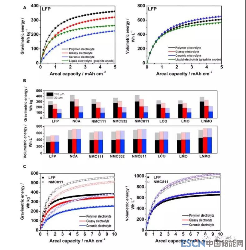 圖1展示了目前人們廣泛使用和研究的能源存儲(chǔ)技術(shù)的體積能量密度與質(zhì)量能量密度,圖中可以看到隨著時(shí)代的發(fā)展,鉛酸電池和Ni-Cd電池逐漸被淘汰。而開(kāi)始于1970s和1990s的Ni-MH、石墨-LCO電池也無(wú)法滿(mǎn)足現(xiàn)代市場(chǎng)的需求。而將鋰離子電池中的石墨負(fù)極換成Li金屬負(fù)極,并且匹配相應(yīng)的固態(tài)電解質(zhì)以及目前鋰離子電池常用的正極材料便可顯著提升其能量密度。作者以3.5V 的Li/SPE/ LFP 電池為例,當(dāng)LFP的活性物質(zhì)質(zhì)量為2 mAh/cm2時(shí),其電池的能量密度便能夠達(dá)到300 Wh/kg,如圖2A所示。而當(dāng)匹配高Ni的NMC811正極材料時(shí),則表現(xiàn)出更高的能量密度,如圖2C所示。另外,作者強(qiáng)調(diào)固態(tài)電解質(zhì)厚度對(duì)于電池的能量密度具有很大的影響,例如:當(dāng)將固態(tài)電解質(zhì)厚度由100um降到30um時(shí),基于Li/glassyelectrolyte/NCM811電池的質(zhì)量能量密度由原來(lái)的210 Wh/kg,可以提高到 350 Wh/kg,如圖2B所示。