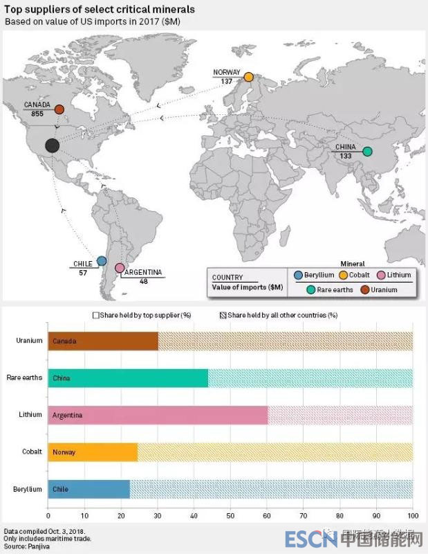 中國儲能網(wǎng)訊:雖然芯片制造的關(guān)鍵技術(shù)在美國人手里,但是一些重要的金屬材料卻嚴(yán)重依賴進(jìn)口,在貿(mào)易戰(zhàn)中美國未必占得了便宜。如下圖所示,2017年美國進(jìn)口的鈾、稀土、鋰、鈷、鈹?shù)目傤~(以美元計)以及最大進(jìn)口來源國所占的比例是:
