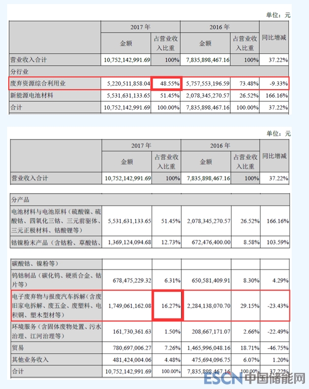 作為主營業(yè)務(wù)其一便是電池回收的格林美來說,電子廢棄物的拆解業(yè)務(wù)一直是公司重點戰(zhàn)略之一,格林美表示將積極探索再生資源料場運營模式,轉(zhuǎn)型升級城市礦山業(yè)務(wù)。 格林美在國內(nèi)率先提出“資源有限、循環(huán)無限”的產(chǎn)業(yè)理念,積極倡導(dǎo)開采“城市礦山”,突破性解決了中國在廢舊電池、電子廢棄物與報廢汽車等典型廢棄資源綠色處理與循環(huán)利用的關(guān)鍵技術(shù),在湖北、湖南、江西、河南、天津、江蘇、浙江、山西和內(nèi)蒙古等省市和南非德班市建成十六大循環(huán)產(chǎn)業(yè)園,建成廢舊電池與動力電池大循環(huán)產(chǎn)業(yè)鏈,鈷鎳鎢資源回收與硬質(zhì)合金產(chǎn)業(yè)鏈,電子廢棄物循環(huán)利用產(chǎn)業(yè)鏈,報廢汽車綜合利用產(chǎn)業(yè)鏈,廢渣、廢泥、廢水循環(huán)利用產(chǎn)業(yè)鏈等五大產(chǎn)業(yè)鏈,年處理廢棄物總量三百萬噸以上。 從格林美2017年營業(yè)收入構(gòu)成中,我們可以看到廢棄資源綜合利用業(yè)占公司總營業(yè)收入的48.55%,近乎一半。