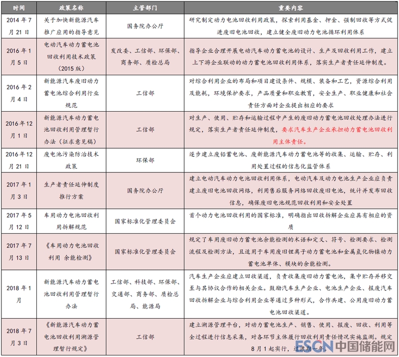 針對如此大規(guī)模報廢的動力電池,國家高度重視,政策也密集出臺,不斷出臺動力電池回收政策,完善回收體系建設(shè)。早在2016 年 12 月,工信部便發(fā)布《新能源汽車動力蓄電池回收利用管理暫行辦法》(征求意見稿),明確了汽車生產(chǎn)企業(yè)承擔(dān)動力蓄電池回收利用主體責(zé)任。2018 年 3 月 2 日,工業(yè)和信息化部、科技部、環(huán)境保護(hù)部、交通運輸部、商 務(wù) 部、質(zhì)檢總局、能源局聯(lián)合發(fā)布《關(guān)于組織開展新能源汽車動力蓄電池回收利用試點工作的通知》,要求構(gòu)建回收利用體系,探索多樣化商業(yè)模式,鼓勵產(chǎn)業(yè)鏈上下游企業(yè)進(jìn)行有效的信息溝通和密切合作,以滿足市場需求和資源利用價值最大化為目標(biāo),建立穩(wěn)定的商業(yè)運營模式,推動形成動力蓄電池梯次利用規(guī)模化市場。