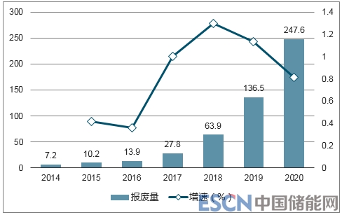 中國動力電池報廢回收量(千噸):