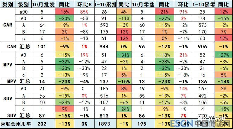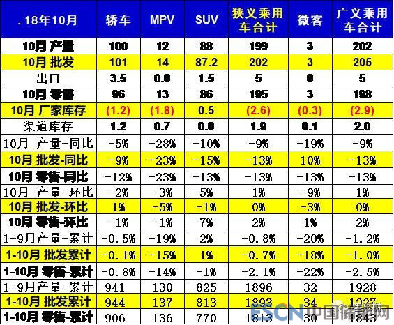 10月車市產(chǎn)銷增速偏低稍低于預(yù)期增速,其中的SUV市場(chǎng)增速貢獻(xiàn)度減小,而MPV的10月增速下滑帶來(lái)車市的增速偏低,10月的轎車零售增速-12%弱于于18年均增速-1%較多,MPV的調(diào)整力度大,MPV因素形成較大的車市下滑影響。SUV零售表現(xiàn)也是較差。