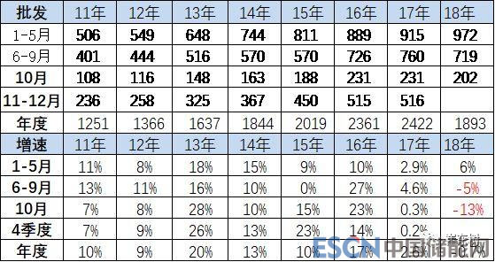 18年1-10月份車市批發(fā)增量達(dá)到-13萬(wàn)臺(tái),同比增長(zhǎng)-1%,相對(duì)于17年1到10月份的同比增長(zhǎng)速度3%表現(xiàn)較弱。17年10月增速0%,今年10月批發(fā)增-13%,今年的增長(zhǎng)較去年下降了近13個(gè)百分點(diǎn)。