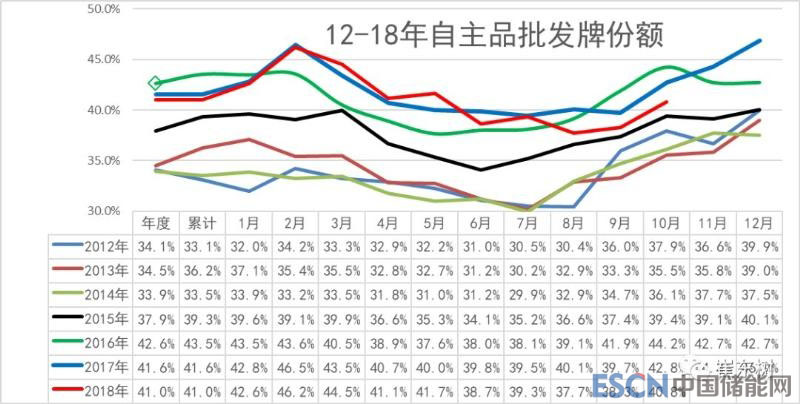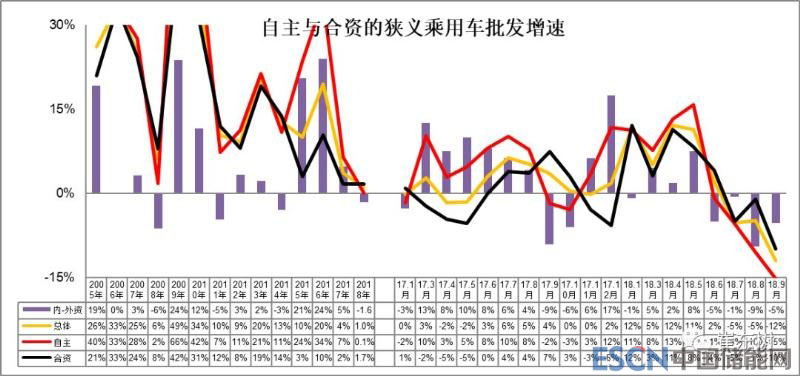 18年年度份額看的自主品牌走勢(shì)轉(zhuǎn)弱,年度批發(fā)增速0%,稍低于行業(yè)增速,零售也稍弱于行業(yè)平均。在15-17年自主持續(xù)超越合資后,18年以來(lái)自主面臨一定的調(diào)整壓力。