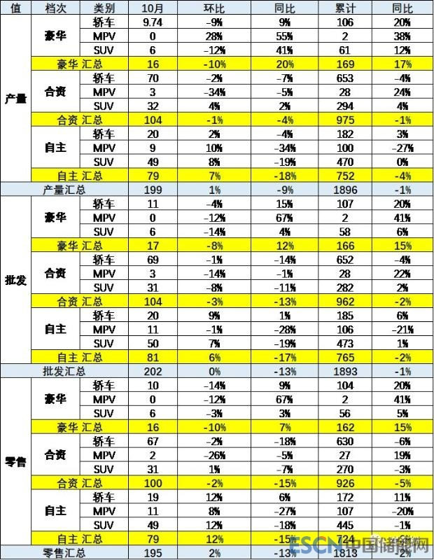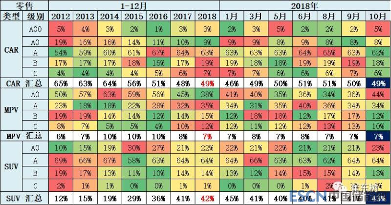 此表用體現(xiàn)的是每一個(gè)細(xì)分類別占上一層級(jí)總零售量的比重,與包含出口和庫(kù)存變化的批發(fā)增長(zhǎng)有所差異。18年10月的市場(chǎng)體現(xiàn)MPV弱趨勢(shì)特征明顯,轎車市場(chǎng)的地位處于逐步恢復(fù)的狀態(tài),SUV走勢(shì)較平穩(wěn)。轎車中的中高級(jí)別走勢(shì)較好,低端的電動(dòng)轎車有所恢復(fù)。