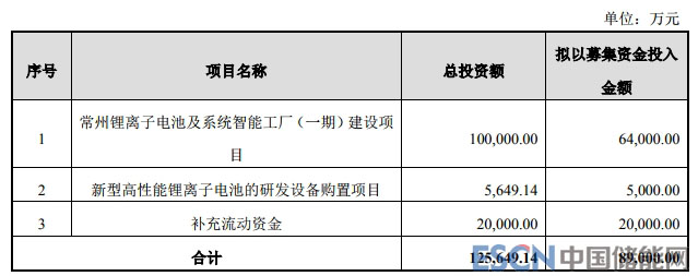 公告顯示,常州鋰離子電池及系統(tǒng)智能工廠(一期)建設(shè)項(xiàng)目總投資額100,000.00萬元,其中建設(shè)投資95,686.90萬元,鋪底流動(dòng)資金4,313.10萬元。擬使用募集資金投資金額為64,000.00萬元,自籌資金投資36,000.00萬元,項(xiàng)目擬建設(shè)鋰離子電池的國際一流智能化生產(chǎn)線。該項(xiàng)目實(shí)施主體為公司全資子公司鵬輝能源常州動(dòng)力鋰電有限公司,建設(shè)期為18個(gè)月,第二年投產(chǎn)并達(dá)到設(shè)計(jì)能力的50%,第三年達(dá)到設(shè)計(jì)能力的100%。