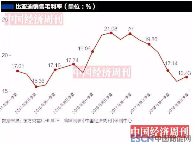中國儲能網(wǎng)訊:近日,國內(nèi)電動汽車龍頭比亞迪(002594.SZ)交出2018年三季度業(yè)績報告,扣除政府補(bǔ)助和賣資產(chǎn)等非經(jīng)常性損益后,前三季度歸屬上市公司股東凈利潤虧損1.65億元,同比下滑108.38%,創(chuàng)出自2015年以來新低;公司前三季度銷售毛利率只有16.43%,低于2015—2017年同期17.74%21.08%的水平。