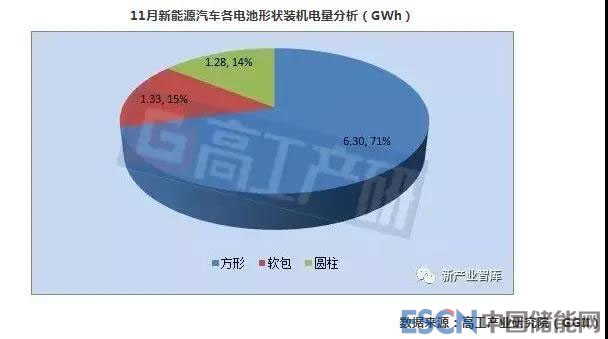 從不同電池形狀來看,11月份方形電池裝機(jī)電量約6.30GWh,占比71%,較上月下降4個(gè)百分點(diǎn);軟包電池裝機(jī)電量約1.33GWh,占比15%,較上月上升1個(gè)百分點(diǎn);圓柱電池裝機(jī)電量約1.28GWh,占比14%,較上月上升3個(gè)百分點(diǎn)。