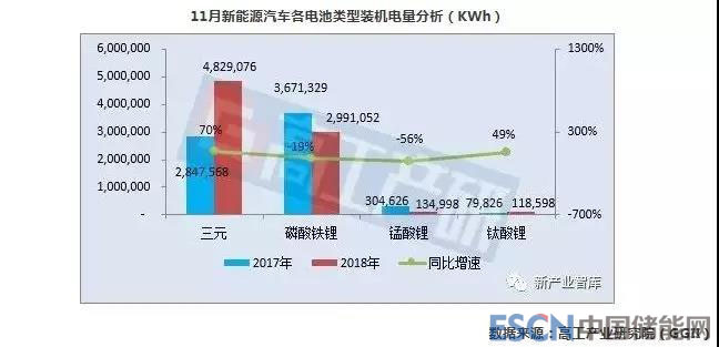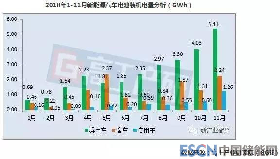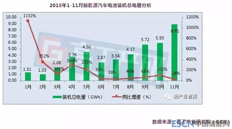 中國儲(chǔ)能網(wǎng)訊:高工產(chǎn)業(yè)研究院(GGII)通過最新發(fā)布的《動(dòng)力電池字段數(shù)據(jù)庫》統(tǒng)計(jì)顯示,2018年11月我國新能源汽車生產(chǎn)約19.2萬輛,同比增長33%,1-11月共計(jì)生產(chǎn)約99.4萬輛,同比增長62%。11月動(dòng)力電池裝機(jī)總電量約8.91GWh,同比增長28%。1-11月動(dòng)力電池裝機(jī)總電量約43.63GWh,同比增長77%。