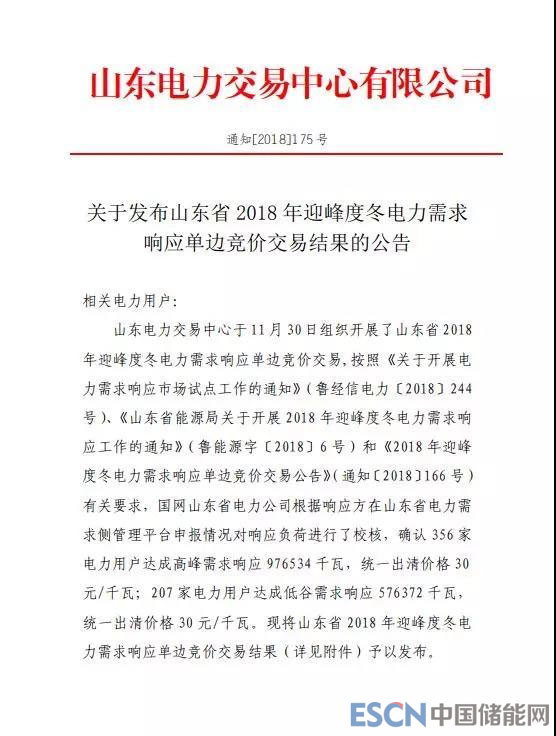 中國儲能網(wǎng)訊:12月7日,山東電力交易中心發(fā)布《關(guān)于發(fā)布山東省2018年迎峰度冬電力需求響應(yīng)單邊競價交易結(jié)果的公告》。