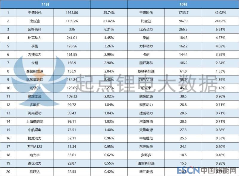 國軒高科11月裝機(jī)量336.01MWh,占比6.21%,擠進(jìn)前三。