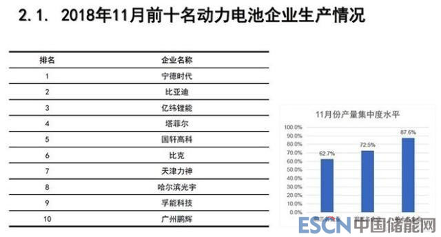 2018年1-11月 中國(guó)汽車(chē)動(dòng)力電池產(chǎn)量簡(jiǎn)報(bào)動(dòng)力電池種類(lèi) 產(chǎn)量(GWh) 占比 三元電池34.456.2%磷酸鐵鋰電池25.842.1%其它材料電池 11.7% 總計(jì)61.2100% 11月份,部分企業(yè)年底沖量速度迅速提升,對(duì)集中度水平有一定稀釋?zhuān)^10月份均有所下降。動(dòng)力電池產(chǎn)業(yè)產(chǎn)量排名前三名企業(yè)共計(jì)生產(chǎn)5.1GWh,占比62.7%;前五名企業(yè)共計(jì)生產(chǎn)5.9GWh,占比72.5%,前十名企業(yè)共計(jì)生產(chǎn)7.2GWh,占比87.6%。