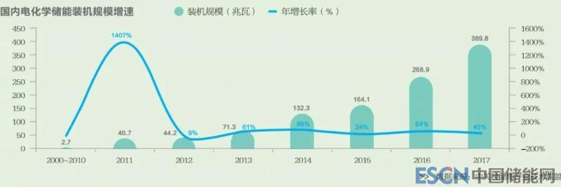 從總體看,我國(guó)電化學(xué)儲(chǔ)能市場(chǎng)在近年呈現(xiàn)逐步上升的趨勢(shì)。2011~2017年,我國(guó)電化學(xué)儲(chǔ)能市場(chǎng)高速發(fā)展,年復(fù)合增長(zhǎng)率達(dá)38%。