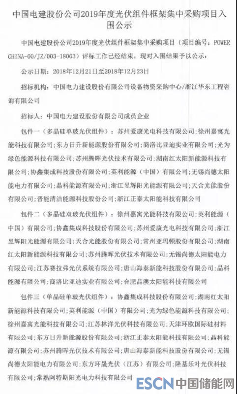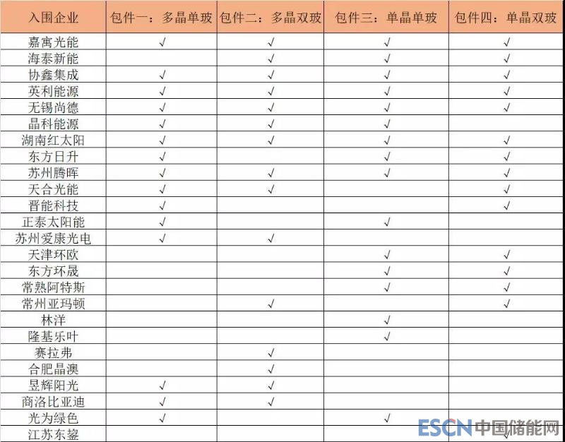 中國儲能網(wǎng)訊:今日,中電建公示了2019年度1GW光伏組件框架集中采購項目的入圍結(jié)果,四個標(biāo)段共計25家企業(yè)入圍,詳情見下表。