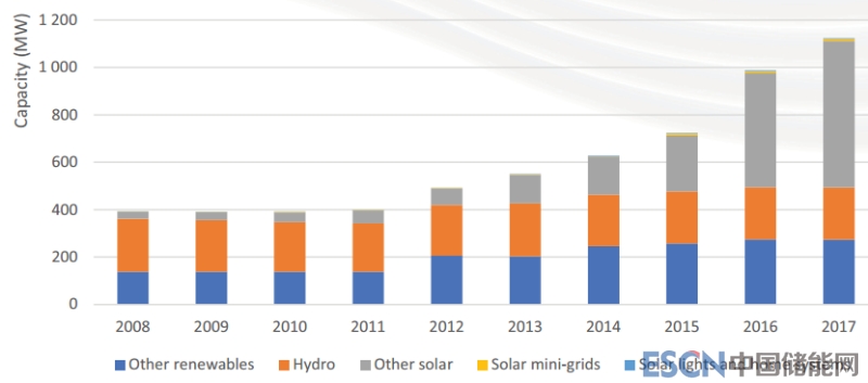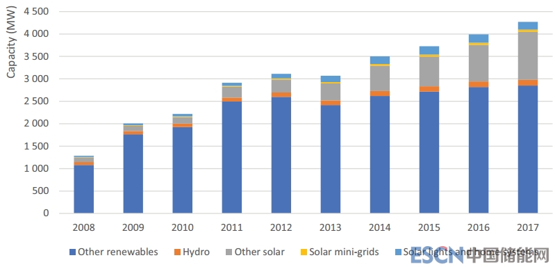 從2008年到2017年,該地區(qū)離網(wǎng)可再生能源累計(jì)裝機(jī)容量已從231 MW增至2017年的近1200 MW。太陽能技術(shù)一直是離網(wǎng)容量增長的關(guān)鍵驅(qū)動力,超過820 MW容量的太陽能照明、家庭系統(tǒng)和微電網(wǎng)等完成了部署。同期,小型水力電網(wǎng)的裝機(jī)容量從124 MW增長到162 MW。