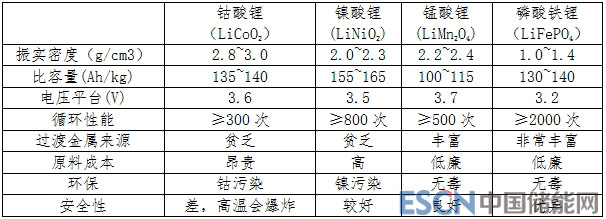 鈷酸鋰(LiCoO2)、鎳酸鋰(LiNiO2)、錳酸鋰(LiMn2O4)、磷酸鐵鋰(LiFePO4)等正極材料的性能比較詳見表1。