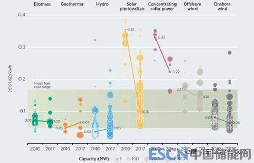 事實上,近年來,可再生能源技術的電力成本正在穩(wěn)步下降,在某些情況下大幅下降,電力成本的下降在自2008年以來的十年中尤其如此,光伏和風電作為可行的商業(yè)選擇取得重大突破。如今,來自可再生能源和技術的發(fā)電成本與化石能源或核能發(fā)電成本相較競爭力日益增強,在許多情況下成本更低。