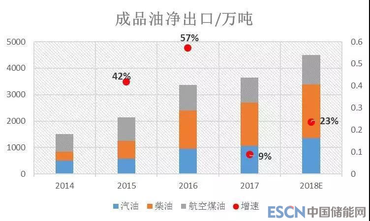 自2014年中國調(diào)整原油進口權(quán)和使用權(quán)政策后,地方煉廠史無前例的擁有了獨立進口和使用原油的機會。短短幾年,地方煉廠轉(zhuǎn)型升級成效顯著,開工率從2014年的35%快速提升至57%,迅速搶占國內(nèi)市場。由于成品油消費持續(xù)低迷,市場持續(xù)供大于求,“三桶油”與地方煉廠之間大打價格戰(zhàn)。在國內(nèi)資源供應(yīng)過剩之下,出口便成為重要的獲利渠道。2015年中國24年來再次成為成品油凈出口國,汽油、柴油、航空煤油三大品種凈出口規(guī)模急劇擴大(如圖 7所示),短短四年從1507萬噸攀升至4500萬噸,年均增長31.5%。2019年預(yù)計還將有4500萬噸的新煉化一體化項目投產(chǎn),或?qū)⒃黾映善酚凸?yīng)超過1000萬噸,可謂“雪上加霜”。屆時大量過剩成品油是不是只能依靠出口消化?如果答案是肯定的,那么照著原油大進、成品油大出的方向發(fā)展下去,形成“兩頭在外”的格局,無論是中國能源安全、經(jīng)濟安全,甚至生態(tài)安全,都將更加脆弱。