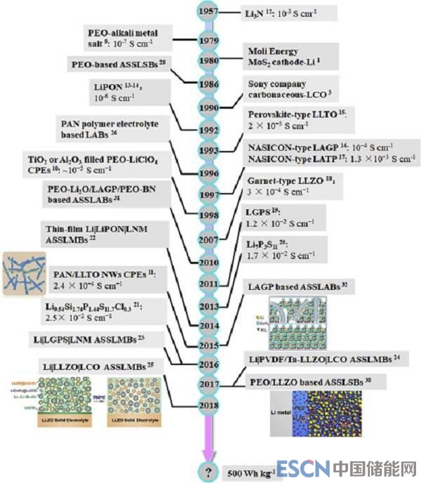圖一、典型固體電解質(zhì)(SSE)和固態(tài)電池(ASSLBs)向ASSLMBs發(fā)展的簡(jiǎn)要年表