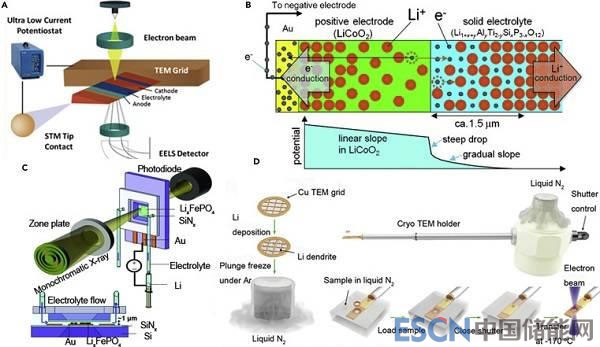 (B)通過(guò)TEM操作的EH,在充電狀態(tài)(頂部)下的電極—電解質(zhì)界面處的鋰離子和電子的分布以及測(cè)量的電位分布(底部);