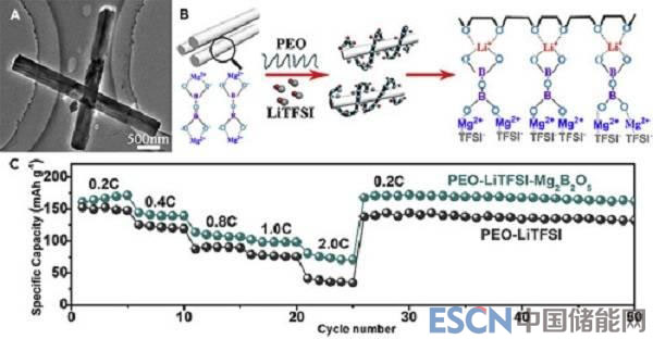 (B)具有Mg2B2O5NWs的CPEs中的鋰離子傳導(dǎo)的示意圖;