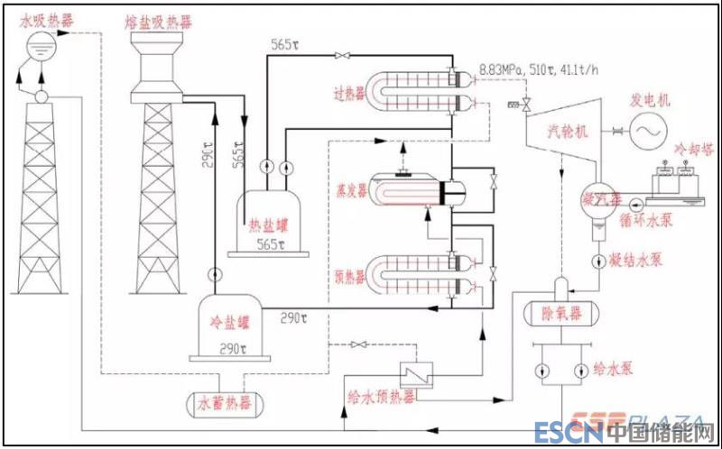 首先,我先介紹一下中控10MW光熱電站。從工藝流程圖我們可以看出,其工藝流程較為復(fù)雜,既包括水工質(zhì),也包括熔鹽工質(zhì),儲(chǔ)能時(shí)長比較短,運(yùn)行較為困難。