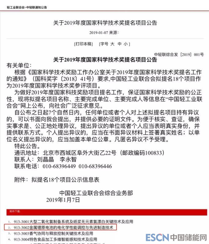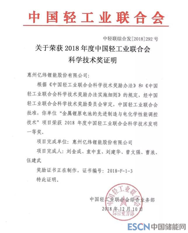 中國儲能網(wǎng)訊:近日,億緯鋰能獲得了輕工業(yè)聯(lián)合會頒發(fā)的2018年度中國科學技術發(fā)明一等獎,獲獎項目為“金屬鋰原電池技術”。該重量級獎項的獲得,是對億緯鋰能鋰原電池技術研究成果的充分肯定,代表了公司優(yōu)秀的研發(fā)能力和技術水平,彰顯了公司在鋰電池行業(yè)領域不斷追求創(chuàng)新的科研精神,預計會對未來公司經(jīng)營業(yè)績產(chǎn)生積極影響。