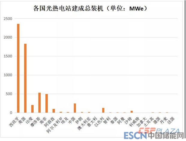 ▲ 2018年各國光熱電站建成總裝機規(guī)模(單位:MWe)