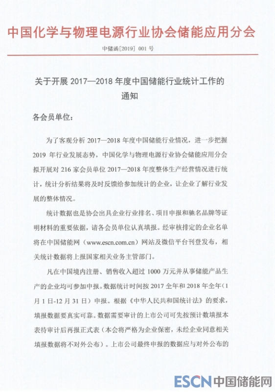 關(guān)于開展2017—2018年度中國儲能行業(yè)統(tǒng)計工作的通知