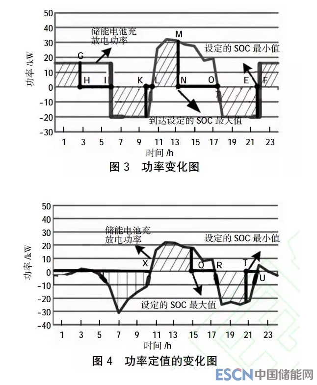 在采取峰谷儲(chǔ)能電家的處理工作時(shí),根據(jù)并網(wǎng)平衡的運(yùn)行可以得到下頁圖3的儲(chǔ)能電池的功率變化圖。