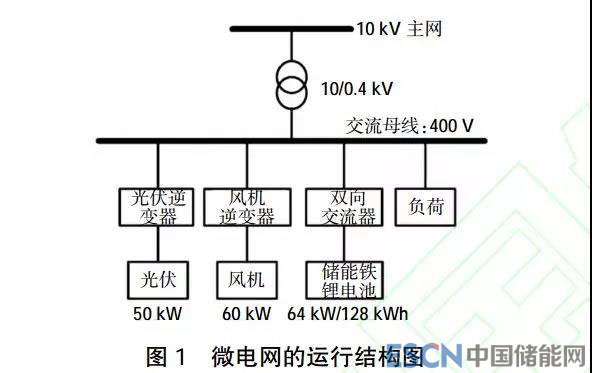 在微電網(wǎng)運(yùn)行的過程中必須要保障運(yùn)行的穩(wěn)定性和可靠性,在獨(dú)立運(yùn)行的過程中一般不會(huì)考慮微電網(wǎng)的經(jīng)濟(jì)性,只有在微電網(wǎng)接入配電網(wǎng)之后,才需要計(jì)算微電網(wǎng)的經(jīng)濟(jì)性。以陜西某區(qū)域的微電網(wǎng)并入配電網(wǎng)的過程為研究對(duì)象,該微電網(wǎng)的運(yùn)行結(jié)構(gòu)如圖1所示。