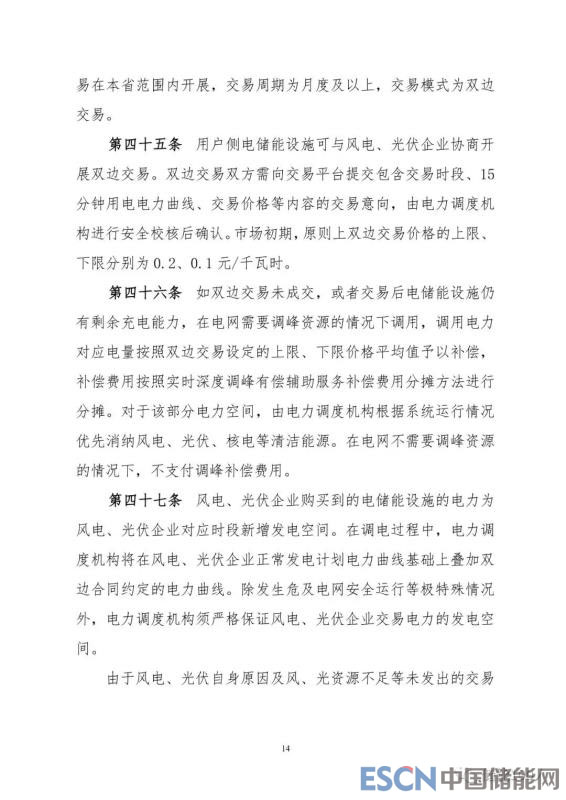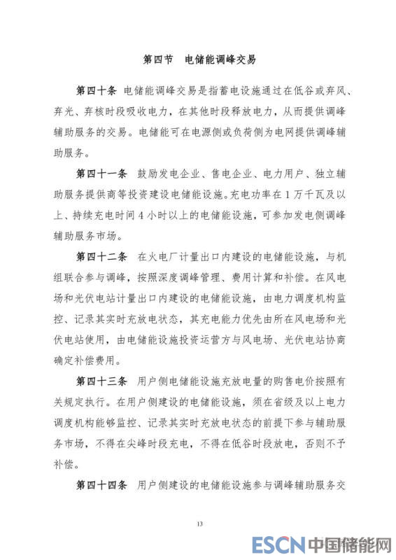 本次文件對電儲能調(diào)峰交易規(guī)則(第三章第四節(jié)41—48條),除增加與“光伏電站”相關(guān)表述外,其它修訂點(diǎn)不多。